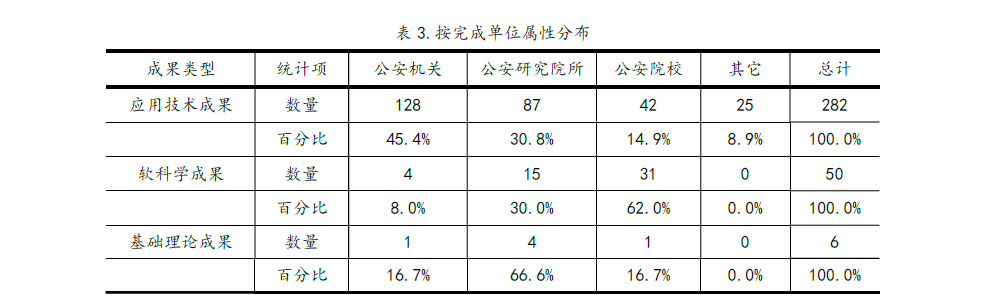 应用技术成果以公安机关为主要研究力量,在282项应用技术成果中,第一完成单位为公安机关的成果128项,占45.4%。软科学成果以公安院校为主要研究力量,在50项软科学成果中,第一完成单位为公安院校的成果31项,占62%;基础理论研究成果有6项(见表3)。