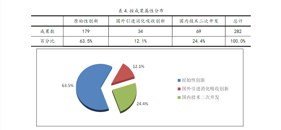 在282项应用技术成果中,“原始性创新”成果占成果总数的63.5%,“国外引进消化吸收创新”成果占12.1%,“国内二次开发”占24.4%(见表4)。