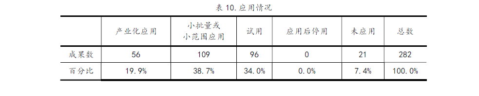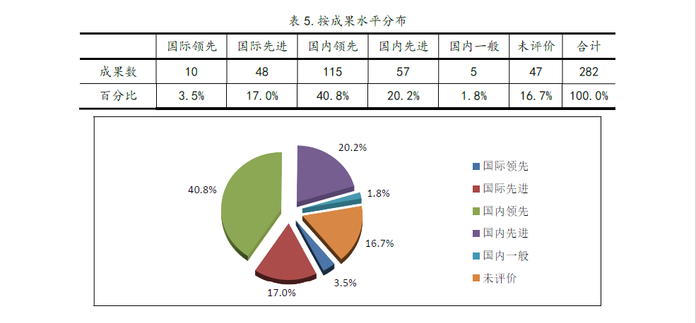 在282项应用技术成果中,“国际领先”占3.5%,“国际先进”占17.0%,“国内领先”占40.8%,“国内先进”占20.2%,“国内一般”占1.8%,“未评价”占16.7%(见表5)。