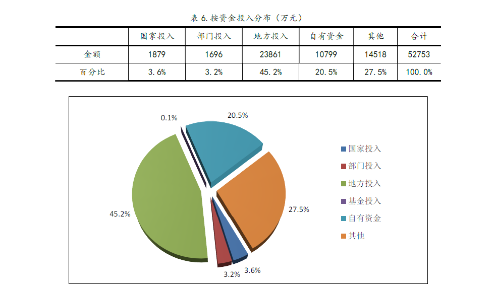 2019年度登记成果的经费实际投入额总计52753万元。其中,国家投入1879万元,占3.6%;部门投入1696万元,占3.2%;地方投入23861万元,占45.2%;自有资金10799万元,占20.5%;其他投入14518万元,占27.5 %(见表6)。