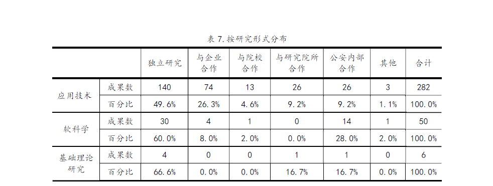 从研究形式看,应用技术成果以独立研究和与企业合作为主,其中,独立研究成果占49.6%,与企业合作成果占26.3%;软科学成果以独立研究为主,占66.6%(见表7)。