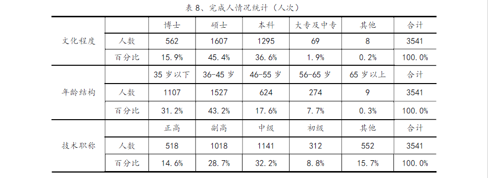 登记成果共涉及完成人3541人,按文化程度、年龄结构和技术职称分布情况(见表8)。
