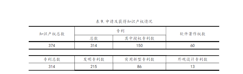 在282 项应用技术类成果中,申请知识产权及获得知识产权数量共374 项,其中,专利314 项,软件著作权60 项。在314项专利中,授权专利150 项(见表9)。