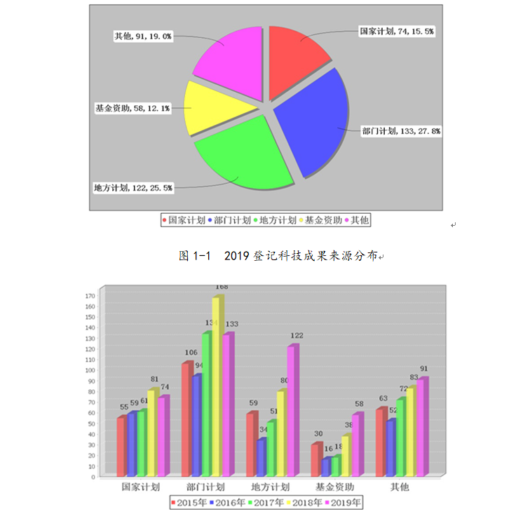 2019年登记的科技成果以部门计划为主,共计133项,占登记总数的27.8%,比2018年减少35项。地方计划122项,占登记总数的25.5%,比2018年增加42项。国家科技计划74项(其中,国家自然科学基金11项,国家科技重大专项8项,国家重点研发计划2项,国际科技合作专项1项),占登记总数的15.5%,比2018年减少7项。基金资助科技成果(除国家基金以外的部门基金、地方基金、民间基金)58项,占登记总数的12.1%,比2018年增加20项。其他科技成果(包括国际合作、横向委托和自选等)91项,占登记总数的19.0%,比2018年增加8项。(见图1-1、1-2)。