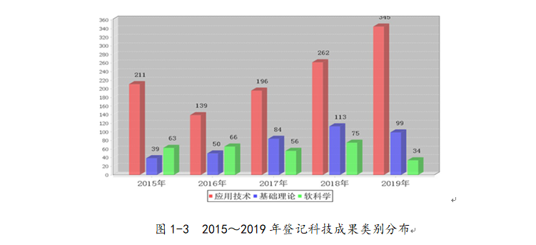 2019年登记科技成果按照成果类别划分可分为应用技术类、软科学类和基础理论类三种,其中,应用技术成果345项,占登记总数的72.2%,比2018年增加83项。基础理论成果99项,占登记总数的20.7%,比2018年减少14项。软科学成果34项,占登记总数的7.1%,比2018年减少41项。(见图1-3)。