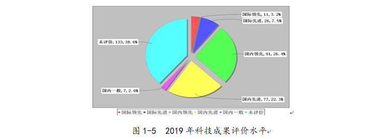 2019年登记的345项应用技术类成果中,水平达到国际领先的成果11项,占3.2%;达到国际先进的成果26项,占7.5%;达到国内领先的成果91项,占26.4%;达到国内先进的成果77项,占22.3%;达到水平一般的成果7项,占2.0%;未评价的成果133项,占38.6%。(见图1-5)。