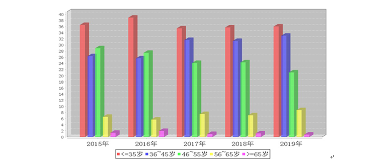 图1-6  2015~2019年科技成果完成人员年龄结构(%)