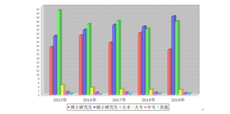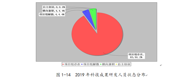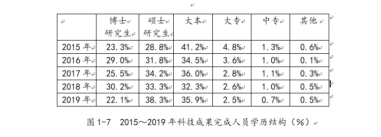2019年,从学历构成看,科技成果完成人员主要集中在:硕士研究生,占比38.3%;本科,占比35.9%;博士研究生,占比22.1%。(见图1-7)。