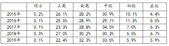 2019年,从职称构成看,主要集中在:中级,占比33.5%;副高,占比32.3%;正高,占比22.4%。(见图1-8)。