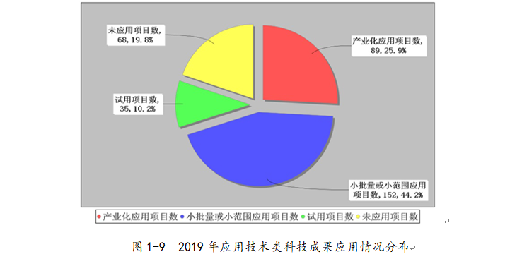 登记的应用技术类科技成果中,小批量或小范围应用项目数的科技成果保持着较高的比例,为152项,占41.8%;产业化应用项目数项目为89项,占24.5%;未应用项目数项目为68项,占18.7%;试用项目数项目为35项,占9.6%;已转化项目数项目为19项,占5.2%;应用后停用项目数项目为1项,占0.3%(见图1-9)。从总体上看,成果未应用的主要原因是管理问题和政策因素,分别占41.5%和20.0%;其次是技术问题、市场问题和资金问题,分别占18.5%、10.8%和9.2%。