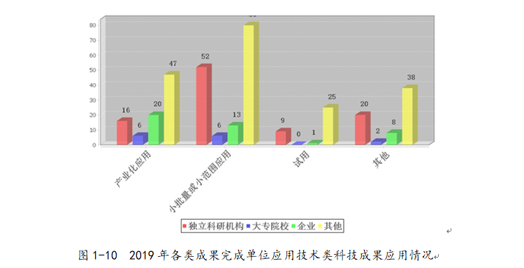 从稳定应用成果在各单位应用技术成果登记中所占比例来看,独立科研机构、大专院校、企业、其他单位分别为16.5%、42.9%、47.6%、24.6%,稳定应用成果比重均比较高。其次为小批量应用项目,分别为53.6%、42.9%、31.0%、41.9%。再次为试用项目,分别为9.3%、0.0%、2.4%、13.1%。(见图1-10)。