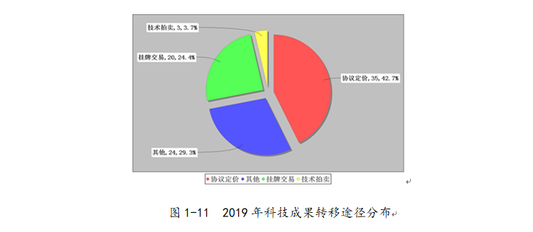 从成果转移途径来看,通过协议定价方式转化的成果35项,占42.7%;通过其他方式转化的成果24项,占29.3%;通过挂牌交易方式转化的成果20项,占24.4%;通过技术拍卖方式转化的成果3项,占3.7%(见图1-11)。