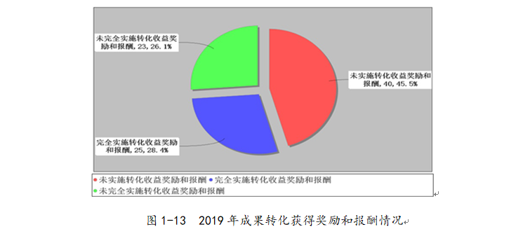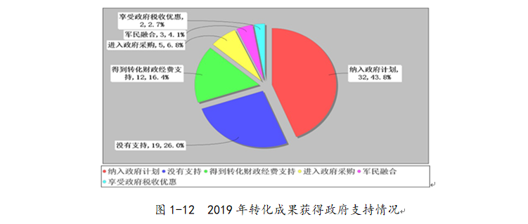 从转化成果获得的政府支持情况来看:32项成果纳入政府计划,占43.8%;19项成果没有支持,占26.0%;12项成果得到转化财政经费支持,占16.4%;5项成果进入政府采购,占6.8%;3项成果军民融合,占4.1%;2项成果享受政府税收优惠,占2.7%(见图1-12)。