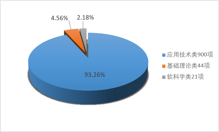 三大类别所占比例与去年相比,2019年度登记的应用技术类成果900项,基础理论类成果44项,软科学类成果21项。