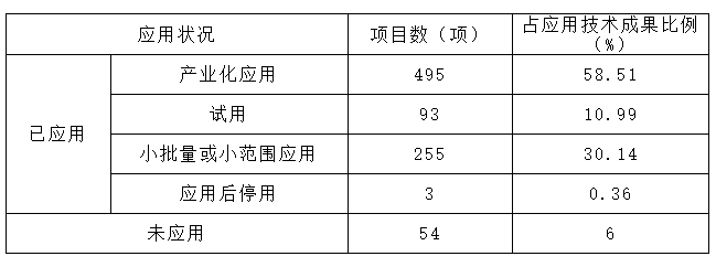 在已应用的成果中,产业化应用的495项,占本年度应用技术类成果的58.51%;试用的93项,占10.99%;小批量或小范围应用的255项,占30.14%;应用后停用的3项。