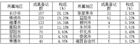 表2 湖南省2019年科技成果登记数量分布(按成果完成单位属地)