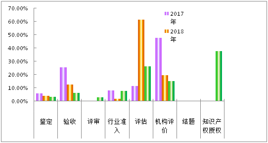 2019年湖南省科技成果评价方式呈现出以知识产权授权/评估(发明专利、计算机软件著作权)为主,第三方机构评价、行业准入、验收为辅,其他方式并存的状态。知识产权授权/评估(发明专利、计算机软件著作权)成果数量逐年增加(因成果登记系统升级为V10.0系统,知识产权授权为升级后新增的一种成果评价方式,登记系统升级前发明专利、计算机软件著作权等成果评价方式统计为评估方式,2019年分析中将评估和知识产权授权合并统计),比2018年增加27.70%;机构评价成果项目数与2018年基本持平;验收项目成果数量有所减少,比2018年减少了38.10%,比2017年减少了70.95%;行业准入成果数量比2018年增加了433.33%,比2017年增加了10.34%;评审项目成果数量增加明显,比2018、2017年增加了22项;鉴定成果数量与2018年基本持平,比2017年减少了35.71%;结题成果与2018年持平,比2017年减少了2项(见图3、表3)。