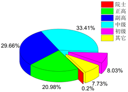 2019年登记的科技成果涉及完成人共3065人,平均每个项目有约14个人参与。如图2所示,36-45岁的中青年为主要科研力量,共1173人,占比总人数的38.27%;小于35岁(含35岁)的成果完成人为862人,占比总人数的28.12%;46-55岁的成果完成人为749人,占比总人数的24.37%。从学历构成看(图3),博士研究生、硕士研究生和本科学历占比最高,分别为35.79%、32.4%和22.58%,本科及以上学历人员占比达90.77%。从职称构成看(图4),中级从业科技人员占比最高,为33.41%,这与科技从业人员中青年人群占比较高有关;正高级人员占比20.98%,副高级人员占比29.66%,高级职称人员占比完成人总数的50.64%;院士占比最小,为0.2%(6人)。