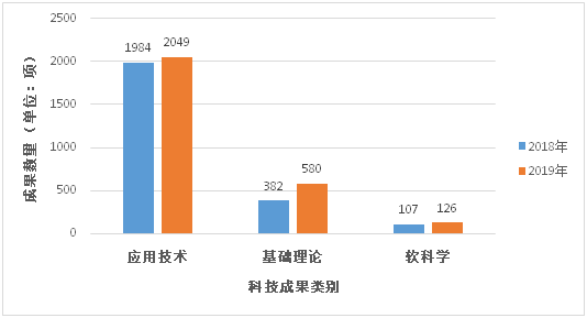 2019年广东省共登记各类科技成果2755项,较2018年增加了282项,增长率达11.40%。登记科技成果中以应用技术成果为主,有2049项,占总数的74.37%,较2018年增加了65项,增长率达3.28%;基础理论成果580项,占总数的21.05%,较2018年增加了198项,增长率达51.83%;软科学成果126项,占总数的4.57%,较2018年增加了19项,增长率达17.76%(见图1)。
