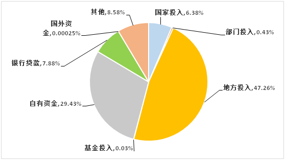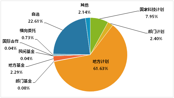 2019年,广东省登记成果的课题来源以地方计划为主,有1698项,占2019年成果登记总数的61.63%;其他来源按数量排序依次为:自选623项、国家科技计划219项、部门计划66项、地方基金63项、其他计划59项、横向委托20项、部门基金5项、民间基金1项和国际合作1项(见图3)。2019年广东省登记的科技成果投入经费总额达1179.11亿元,以地方投入为主,达557.24亿元,占2019年经费来源投入总额的47.26%;其次,自有资金347.02亿元,其他投入101.20亿元,银行贷款92.94亿元,国家投入75.22亿元,部门投入5.08亿元,基金投入0.40亿元,国外资金投入0.003亿元(见图4)。