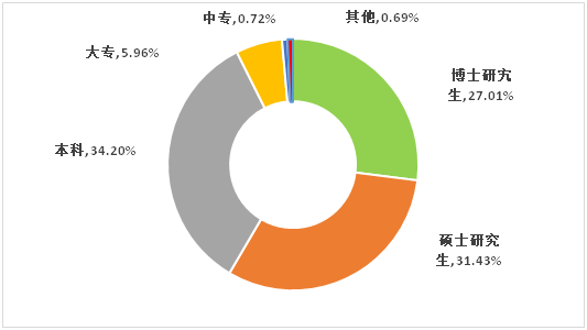 2019年广东省登记成果其完成人共计27028人次,主要集中在45岁以下人员,占研究总人数的69.32%(见图6)。博士研究生、硕士研究生、本科学历分别占总数的27.01%、31.43%、34.20%(见图7)。