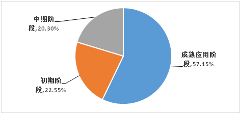 2019年广东省科技成果统计数据显示,在所登记的应用技术类科技成果中,处于初期阶段、中期阶段、成熟应用阶段成果项目数分别为462项、416项和1171项,达到成熟应用阶段的成果占比达57.15%,说明2019年广东省应用技术类成果整体的技术成熟度较高(见图9)。