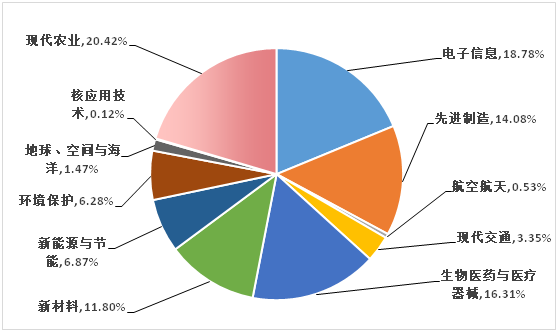 2019年广东省登记的应用技术类科技成果中,高新技术领域成果达到1704项,占应用技术类成果的83.16%,主要分布在现代农业、电子信息、生物医药与医疗器械、先进制造、新材料五个领域,所占比例依次是:20.42%、18.78%、16.31%、14.08%、11.80%,其他领域占比较低(见图10)。