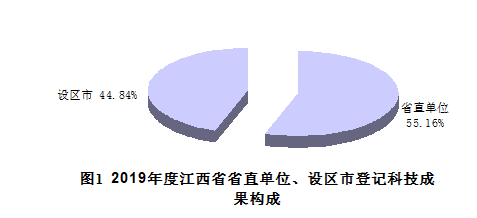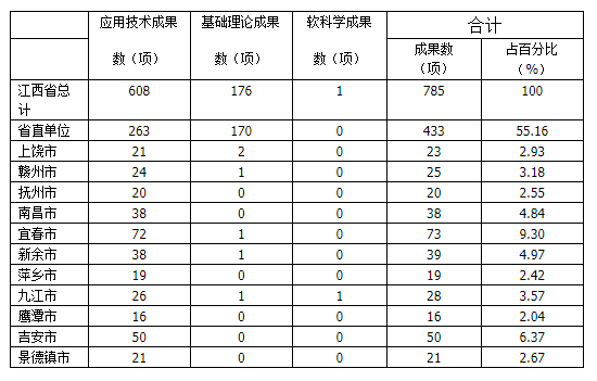 2019年由于加强宣传,江西省科技成果登记在总量上较去年有所上升,全年共登记785项,与去年的695项相比上升了90项,上升12.95%。其中,省直单位的成果登记有433项,占55.16%,比上年度的365项上升了18.63%;设区市的成果登记有352项,占成果登记总数的44.84%,比上年的330项上升了6.67%。全省11个设区市成果登记最多的有73项,最少的为16项,全省各设市区之间仍有差距。其中宜春市为73项,吉安市为50项,分别占总数的9.30%和6.37%,占设区市总数的20.74%和14.20%;新余市为39项,南昌市为38项,分别占总数的4.97%和4.84%,占设区市总数的11.08%和10.80%。(见图1、表1)。表1中设区市的基础理论成果6项,软科学成果1项,较去年有所下降。