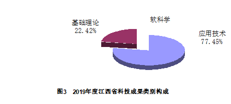 2019年度全省登记的科技成果仍以应用技术成果为主,为608项,与上年相比上升了6.85%,占全年登记成果总数的77.45%;基础理论成果176项,占成果总数的22.42%,与上年相比上升了39.68%;软科学成果1项(见图3)。