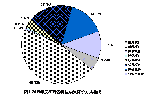 2019年度江西省登记的成果评价方式以验收为主,机构评价、结题为辅,鉴定及其他评价方式并存。登记成果中验收项目359项,占登记成果总数的45.73%,比上年上升12.54个百分点;机构评价项目116项,占14.78%,结题项目144项,占18.34%;知识产权授权项目88项,占11.21%鉴定、评审、评估、行业准入等其他评价方式项目78项,占9.94%(见图4)。