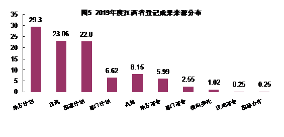2019年度全省登记的科技成果仍以地方财政支持的各类计划项目为主,自选和国家科技计划项目成果占比重也较大(见图5)。其中,国家科技计划项目成果179项(科技重大专项47项,自然科学基金85项,重点基础研究发展计划4项,国家科技支撑计划5项,高技术研究发展计划1项,国际科技合作专项1项,科技型中小企业技术创新基金1项,科研院所技术开发研究专项资金1项,农业科技成果转化资金3项、其它科技计划31项),占登记总量的22.80%;部门计划52项,占6.62%;地方计划230项,占29.30%;自选181项,占23.06%。地方计划、自选项目和国家计划项目是成果的主要来源。