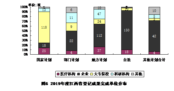 在成果登记数据中,各级各类科技计划项目成果完成单位分布主要集中在企业、大专院校。企业所占比例最高,占44.33%,其次大专院校占26.24%,再次医疗机构占13.38%,独立科研机构占11.08%,其他占4.97%。其中,国家科技计划项目成果中大专院校所占比例最高,占65.92%;地方计划项目中企业比例最高,占48.70%;在自选项目中,企业也是占比例最大,占82.87%,(见图6)。
