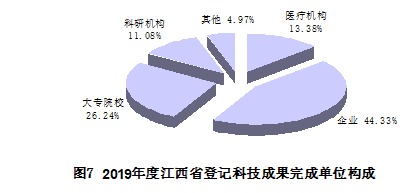 2019年度全省登记的科技成果中,按第一完成单位属性分,企业登记数所占比例最大,共348项,占44.33%;其次是大专院校206项,占26.24%,独立科研机构87项,占11.08%,医疗机构105项,占13.38%,其他单位39项,占4.97%。数据显示,2019年我省科技成果主要分布在企业、大专院校,在成果第一完成单位中所占比例为本年度登记成果完成单位的70.57%,凸显了企业与大专院校在我省科技创新中的主体地位(见图7)。