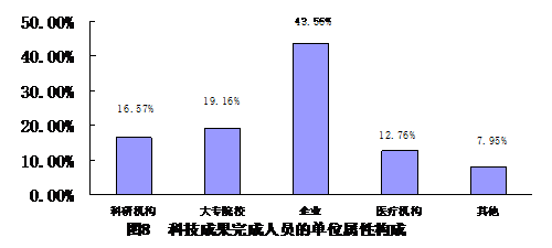 2019年度登记的科技成果涉及到的完成人员共5485人次。以单位属性看,企业和大专院校的科技人员最多。其中,企业科技人员2389人次,占43.56%;大专院校人员1051人,占19.16%;医疗机构700人,占12.76%;科研机构科技人员909人,占16.57%;其他436人,占7.95%(见图8)。