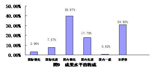 在2019年全省登记的608项应用技术成果中,达到国际领先水平项目18项,占应用技术成果总数的2.96%;达到国际先进水平的46项,占7.57%;达到国内领先和国内先进水平的成果351项,占57.73%;国内一般水平的成果5项,占0.82%。未评价成果188项,占30.92%。国内先进水平以上的项目占总数的68.26%以上。(见图9)。