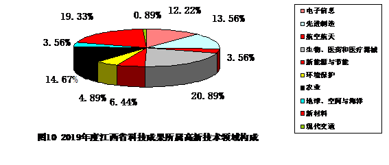 2019年度江西省登记的608项应用技术成果中,有450项属高新技术领域,占登记的科技成果总数的57.32%。其中,电子信息55项,占所登记的高新技术领域成果总量的12.22%;先进制造61项,占13.56%;航空航天16项,占3.56%;现代交通4项,占0.89%;生物医药和医疗器械94项,占20.89%;新材料87项,占19.33%;新能源与节能29项,占6.44%;环境保护22项,占4.89%;地球、空间与海洋16项,占3.56%;现代农业66项,占14.67%。生物医药领域在全省高新技术领域中所占比例最高,其次新材料和农业也都占有较大比例( 见图10)。