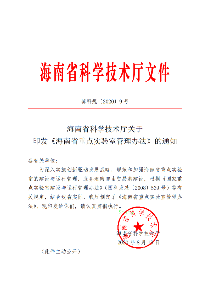 海南省科学技术厅关于印发《海南省重点实验室管理办法》的通知