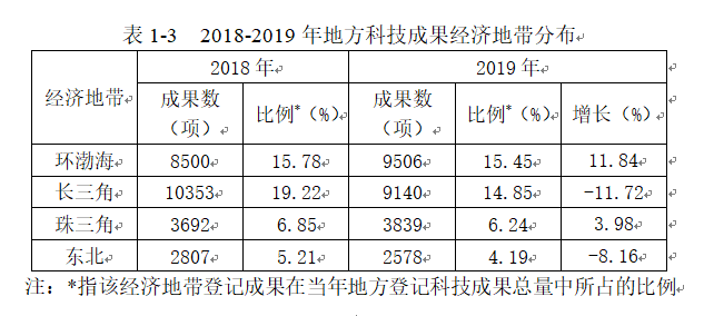 按重点区域经济地带划分,环渤海地区和珠三角地区实现快速增长。环渤海地区仍是科技成果的主要产出地,登记科技成果9506项,同比增长11.84%,占地方登记成果总量的15.45%。珠三角地区登记科技成果3839项,同比增长3.98%。长三角地区和东北地区成果登记数量有所下降,登记成果数量为9140项和2578项,降幅分别为11.72%和8.16%,占地方登记成果总量的比例有所下降(见表1-3)。