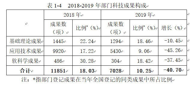 2019年,国务院有关部门科技管理机构、行业协会、中央企业等单位的科技成果登记总量与上年相比下降40.70%,基础理论成果、应用技术和软科学成果较上年均有所下降。2019年,部门登记科技成果共7028项,占全国科技成果登记总数的10.25%。其中,基础理论成果1294项,同比下降10.45%,占全国基础理论成果登记总数的18.46%;应用技术成果5430项,下降45.26%,占全国应用技术成果登记总数的9.06%;软科学成果304项,下降37.45%,占全国软科学成果登记总数的18.42%(见表1-4)。