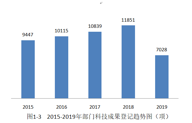 2015-2019年,每年部门登记的科技成果总量在10000项左右,前四年呈平稳增长,2019年出现下滑,较2018年减少4823项(见图1-3)。