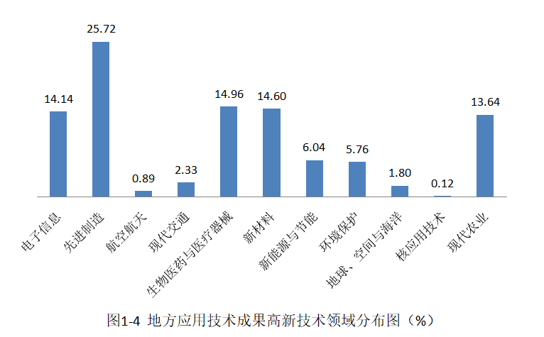 2019年,地方应用技术成果主要分布在五大高新技术领域,依次是:先进制造(比重为25.72%),生物医药与医疗器械(14.96%),新材料(14.60%),电子信息(14.14%)和现代农业(13.64%),这五大领域成果占地方全部高新技术领域科技成果的83.06%(见图1-4)。