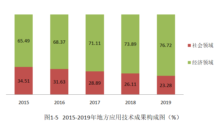按社会、经济领域分类统计,2019年地方应用技术成果在社会领域和经济领域的比例分别为23.28%、76.72%,经济领域的分布比例与上年相比略有增加。2015-2019年,地方应用技术成果主要分布在经济领域,且所占比例逐年增加(见图1-5)。