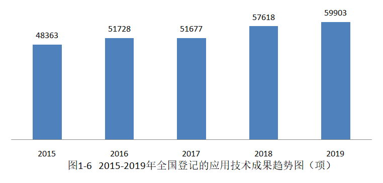 2015-2019年,全国登记的应用技术成果总量整体上呈现逐年增长的态势,从2015年的48363项增加到2019年的59903项,年均增长5.50%(见图1-6)。