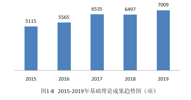 2015-2019年,全国登记的基础理论成果总量基本呈现平稳增长态势,从2015年的5115项增长到2019年的7009项,年均增长8.19%。