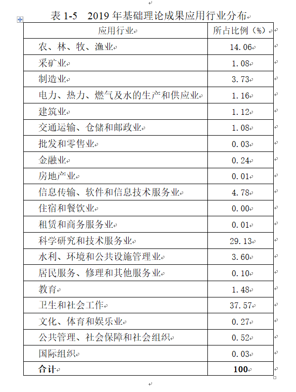 从应用行业来看,2019年登记的基础理论成果主要集中在卫生和社会工作,科学研究和技术服务业,农、林、牧、渔业三个领域,所占比例分别达到37.57%、29.13%和14.06%(见表1-5)。