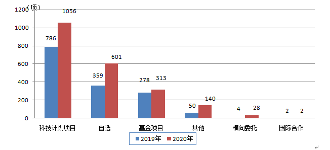 2020年,全省登记的科技成果以各类科技计划项目为主,政府资金起主导作用,其中来源于各类科技计划项目的成果1056项,比上年增长34.4%,占登记成果总数的49.3%;自选项目601项,比上年增长67.4%,占28.1%;基金项目313项,比上年增长12.6%,占14.6%;横向委托28项,比上年增加24项,占1.3%;其他项目140项,比上年增长了1.8倍,占6.5%;国际合作2项,与上年对比无变化。