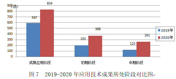 在1463项应用技术成果中,834项成果处于成熟应用阶段,占57.0%;368项成果处于初期阶段,占25.2%;261项成果处于中期阶段,占17.8%。