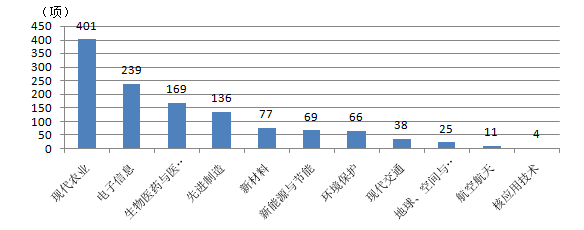 统计数据显示,在1463项应用技术成果中,有1235项属于高新技术领域,占到应用技术成果八成以上。我省科技成果共涉及11大类高新技术领域,其中现代农业、电子信息、生物医药与医疗器械、先进制造、新材料、新能源与节能和环境保护七大领域的成果占到了全部高新技术领域的九成以上,特别是现代农业领域达401项,占32.5%。