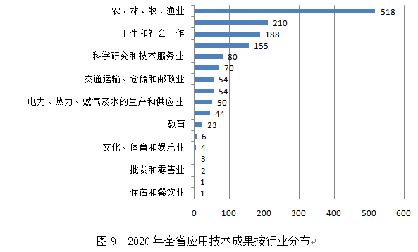 从成果应用的国民经济行业来看,1463项应用技术成果,广泛应用在17个行业中,其中,在农林牧渔业、制造业、卫生和社会工作、信息传输/软件和信息技术服务业四个行业中科技成果应用的最多,科技成果数量依次为518项、210项、188项和155项,这四个行业的科技成果占应用技术成果总量的73.2%。