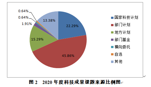 登记的157项科技成果中,国家科技计划35项,占全年总数22.29%;部门计划72项,占全年总数45.86%。地方计划24项,占全年总数15.29%;横向委托1项,占全年0.72%,部门基金3项,占全年总数1.91%。自选1项,占全年总数0.72%;其他21项,占全年总数13.38%。